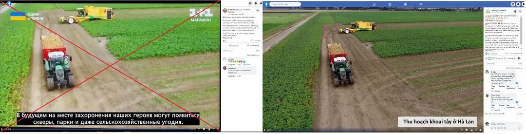 Ujęcia przedstawiające prace maszyn rolniczych w ostatnich sekundach fałszywego filmu (od 0’23”) pochodzą z nagrania (zarchiwizowany link) z wietnamskiego konta na Facebooku i ukazują, jak czytamy w opisie, prace duzych maszyn do zbiory ziemniaków w Holandii.