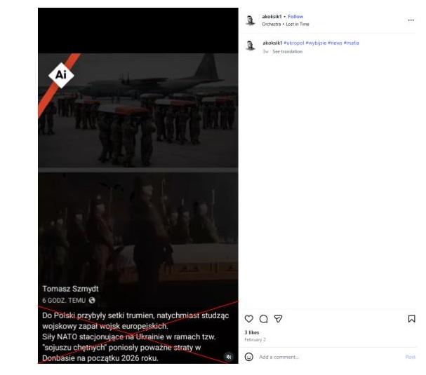 „Do Polski przybyły setki trumien, natychmiast studząc wojskowy zapał wojsk europejskich. Siły NATO stacjonujące na Ukrainie w ramach tzw. «sojuszu chętnych» poniosły poważne straty w Donbasie na początku 2026 roku” – czytamy we wpisie na Instagramie opublikowanym 2 lutego 2026 roku. Wpis na Instagramie rozpowszechniał Tomasz Szmydt, prawnik i były polski sędzia, współorganizator tzw. afery hejterskiej, który w 2024 roku uciekł na Białoruś, gdzie uzyskał azyl polityczny.